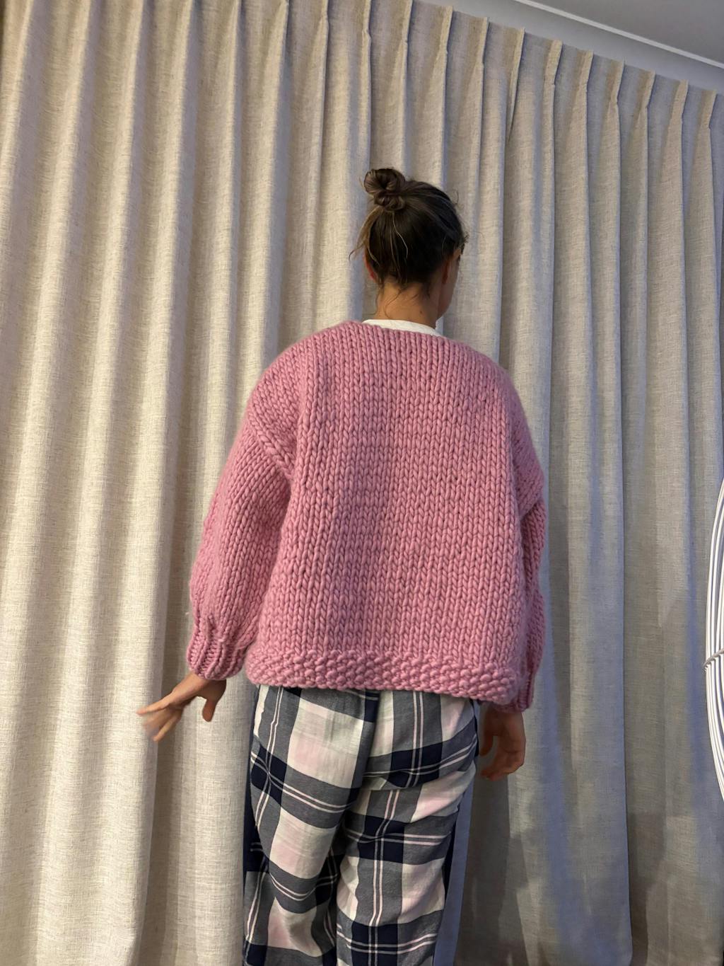 I bought this pattern and after starting I decided I’d like some texture. I contacted the team and they kindly sent me the pocket rocket pattern as I had requested, without hesitation right away. This is my second project from the JMC and I can’t rate them highly enough! Both patterns are super easy to follow. I did adjust the sleeves to a shorter length which was easy to do, and the yarn is beautiful with no knots or joins in the balls.