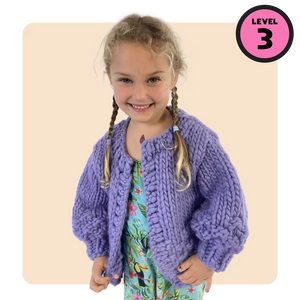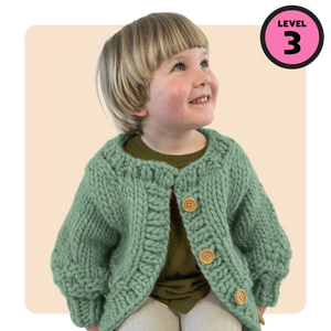 Beginner! This Cardi is knit from the bottom up and worked flat in one piece with circular needles. The sleeves are then knit in the round- which might all sound super complicated but never fear! We’ll be with you all the way.