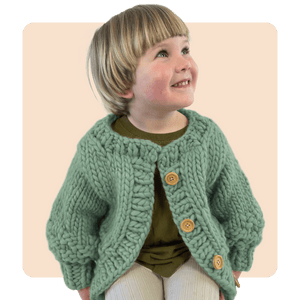 This Cardi is a classic button-up style (buttons not included but we recommend ones at least 20mm) with a wide crew neck (all the kids we spoke to said a tight collar was a big 'no way'! hehe) and ribbed edging and hem. It can be worn open for a slightly oversized vibe or buttoned up for a more snug situation.