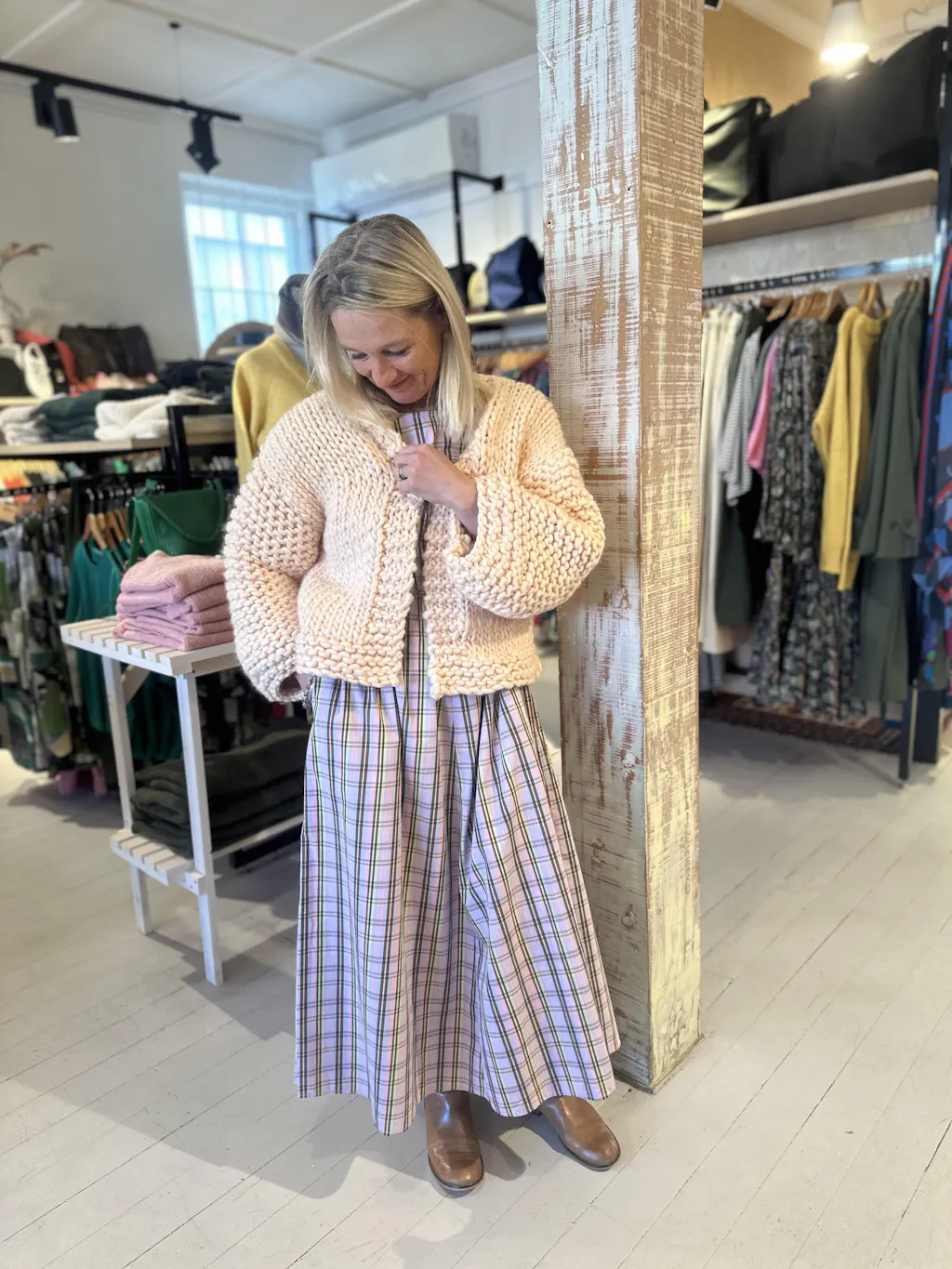 With a cropped body and textured cropped sleeves, this Cardi is the perfect chuck-me-on piece!