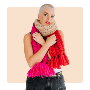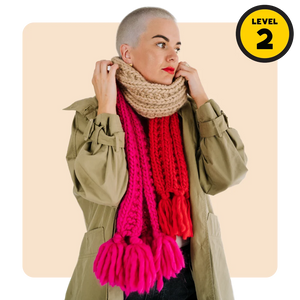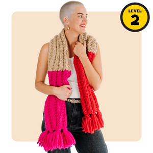 New to this knit shiz? No sweat! This scarf uses simple stitches and is knit flat. The tassels look fancy but they’re easy peasy once you know how (and that’s where we come in!)